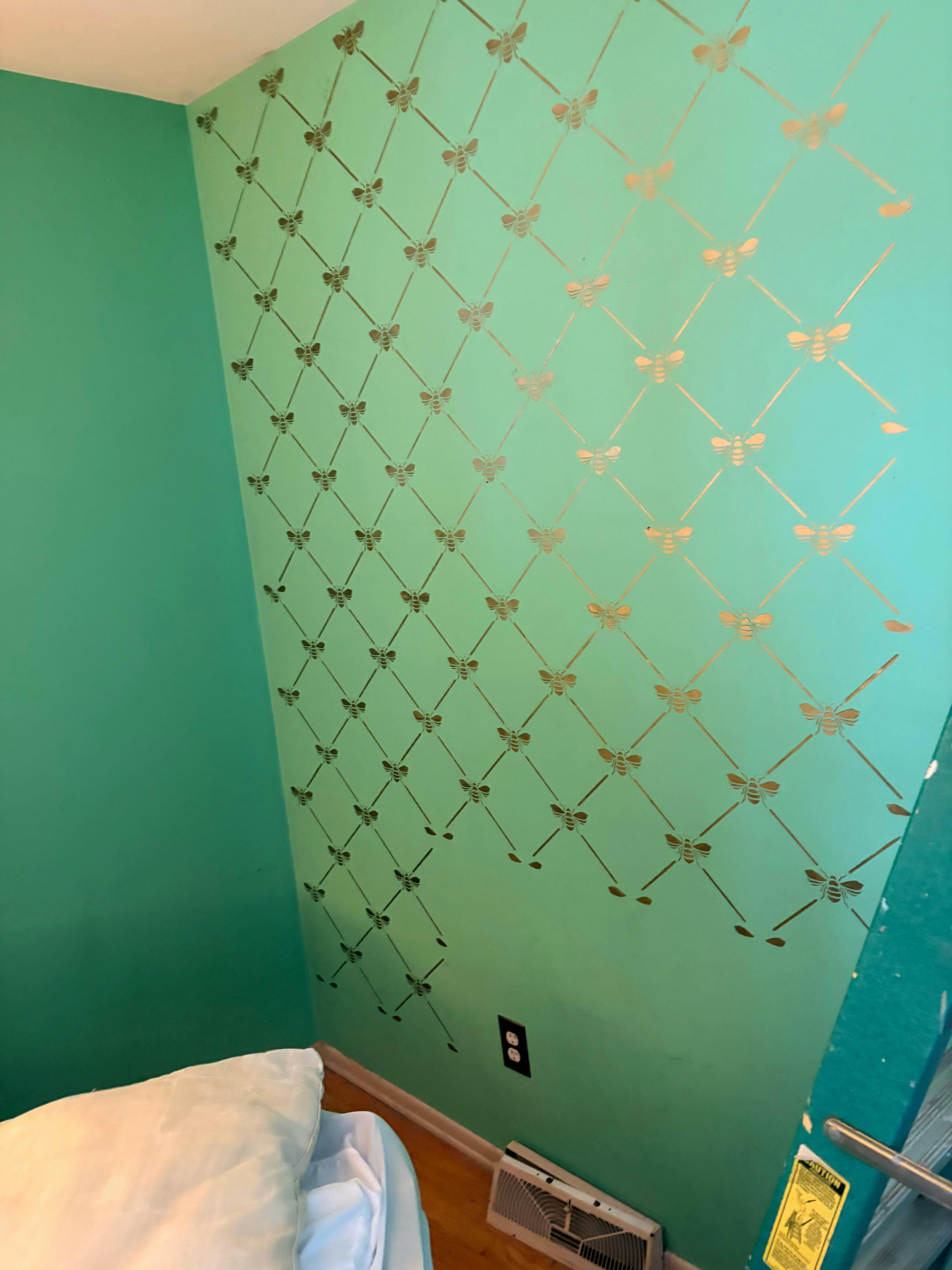 Add a touch of French elegance to your wall with our French Bee Trellis Wall Stencil. This allover damask wallpaper stencil features a classic Napoleonic Bee set in an allover trellis pattern. It's perfect for a romantic bedroom or formal dining room, OR stencil it on fabric drapes for a custom touch! Finish off the cute pattern with other bee inspired designs such as our The Buzz Allover Bee Stencil, Honeycomb Allover Wall Stencil, and Beehive Allover Furniture Stencil.